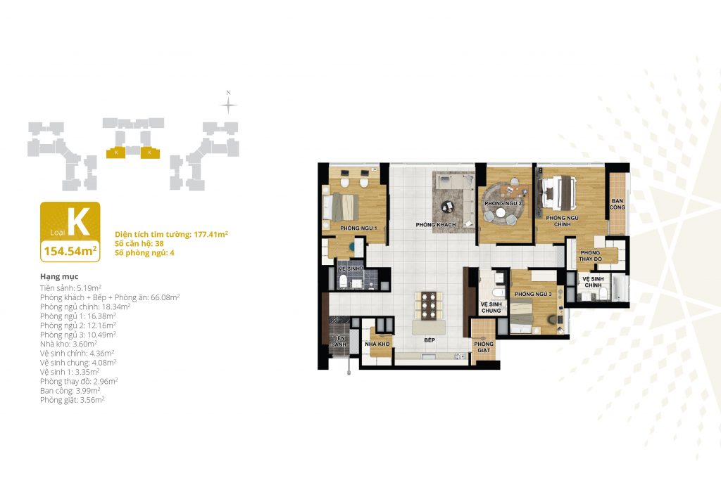 Căn hộ 4 ngủ tại Starlake là căn hộ loại K (ký hiệu K1 và K3) với tổng số căn hộ là 38 và chỉ có tại tòa 902. Căn hộ loại K có diện tích tim tường là 177.41m2 và diện tích thông thủy là 154.54m2. Phòng khách, phòng bếp và phòng ăn được thiết kế liền mạch. Khu vực bếp có cửa thông ra logia/phòng giặt và có một nhà kho với sức chứa lớn. Phòng ngủ Master có ban công view thoáng, phòng tắm được trang bị nội thất cao cấp đến từ Hàn Quốc và bồn tắm lớn, phòng thay đồ rộng rãi. Phòng ngủ 1 có phòng tắm bên trong cùng hệ thống tủ quần áo, bàn trang điểm. Tất cả các phòng ngủ đều có cửa sổ lớn, đón ánh sáng và khí trời.